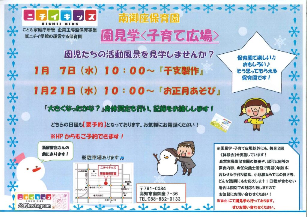 2025年12月19日 / 最終更新日 : 2025年12月19日 高知卸商センター協同組合 管理者 お知らせ ニチイキッズ南御座保育園 園見学子育て広場🎍(1月) 1月の「ニチイキッズ南御座保育園 園見学≪子育て広場≫」のお知らせです。 7日(水)10時00分~ : 『干支製作』🐎 21日(水)10時00分~ : 『お正月あそび』 『 大きくなったかな?』 身体測定も行い、記録をお渡しします。 ★どちらの日程も【要予約】となっております。 お気軽にお電話ください! ( ☎ 088-882-0133 ) * HPからも予約可能です❣